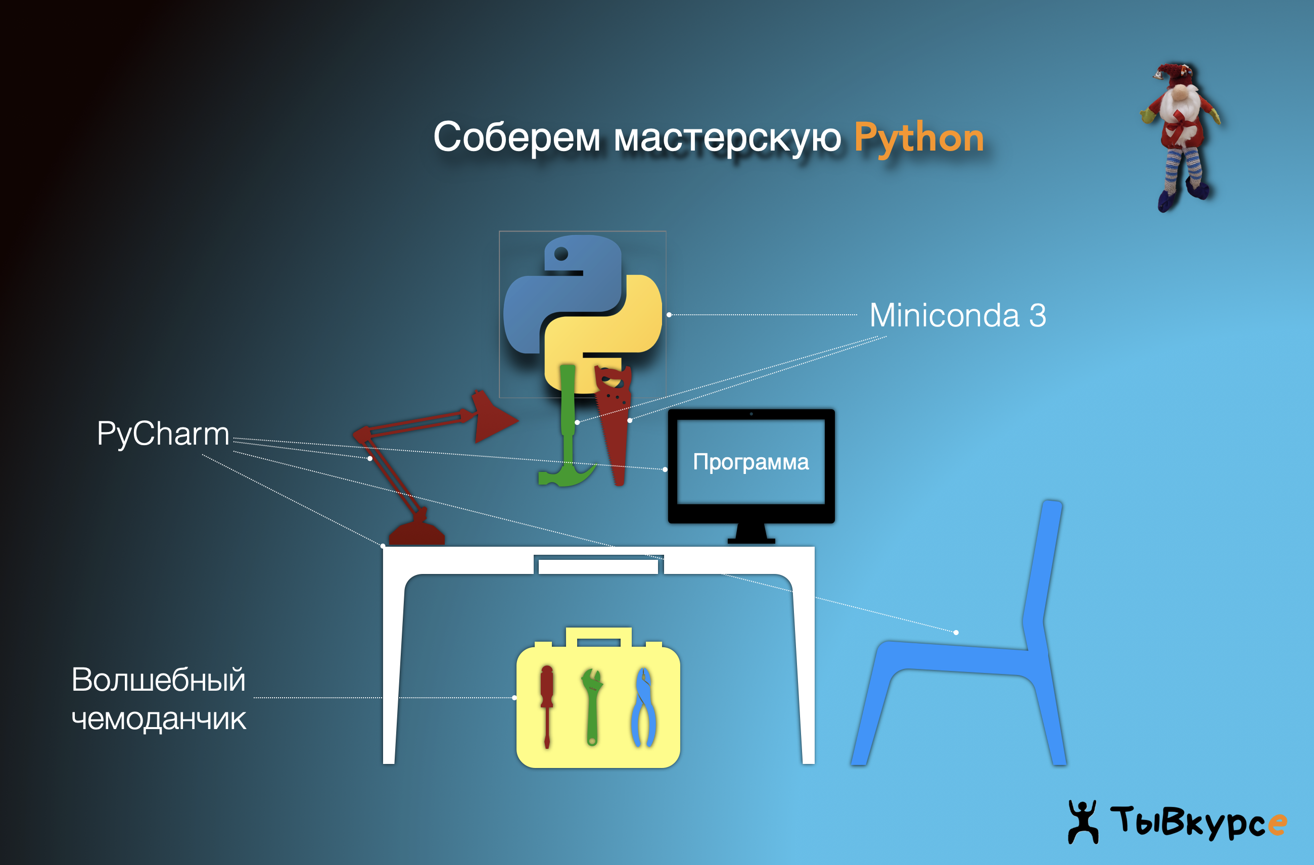 Ты научишься устанавливать среду разработки, интерпретатор и пакеты, то есть мастерскую для программирования на языке Python. |