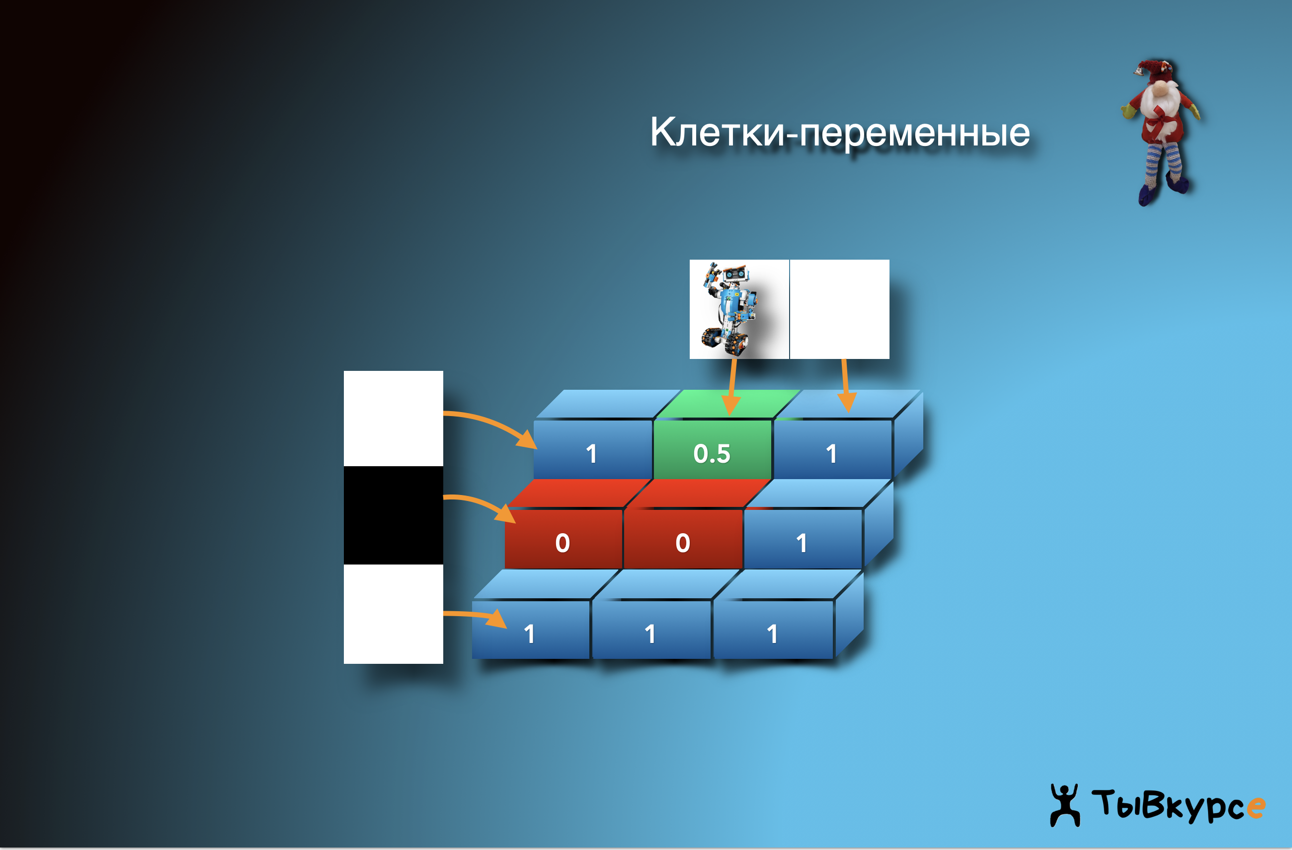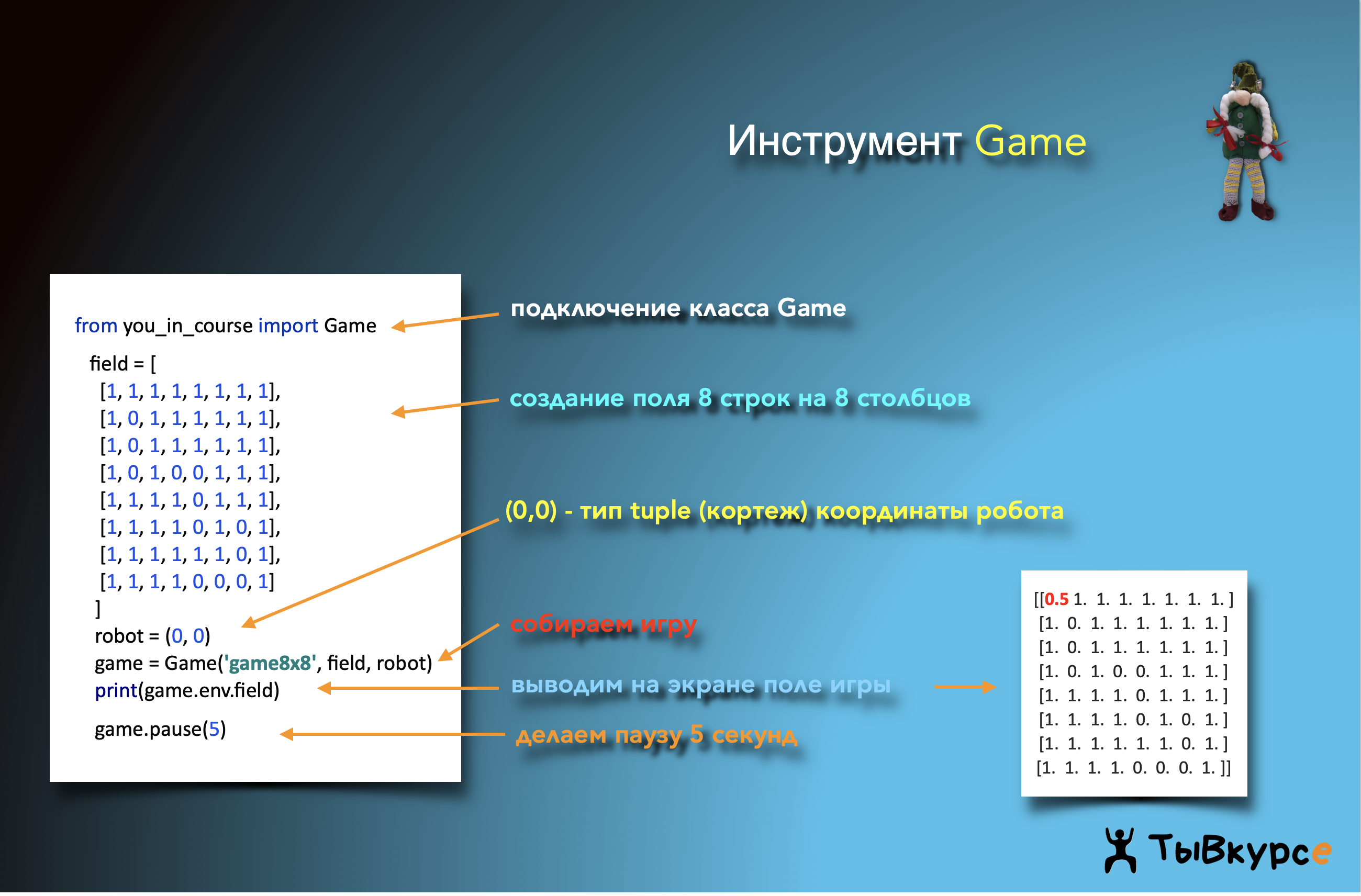 А еще ты сможешь сделать своими руками игру Поиск сокровищ, в которой робот будет искать клад, обходя препятствия. Познакомишься с массивами в Python, без которых невозможно построить игровое поле, размещать и перемещать робота в твоей игре. Узнаешь, что такое координаты, векторы и матрицы, циклы и условный оператор. |